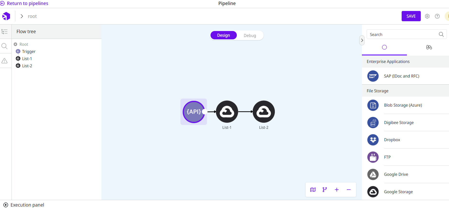 {{ message.pageToken }}Double Braces give access to the previous component output. Given that, the Page Token generated by the first Google Storage ("List-1") allows the next files listing page to be fetched to the second Google Storage ("List-2").