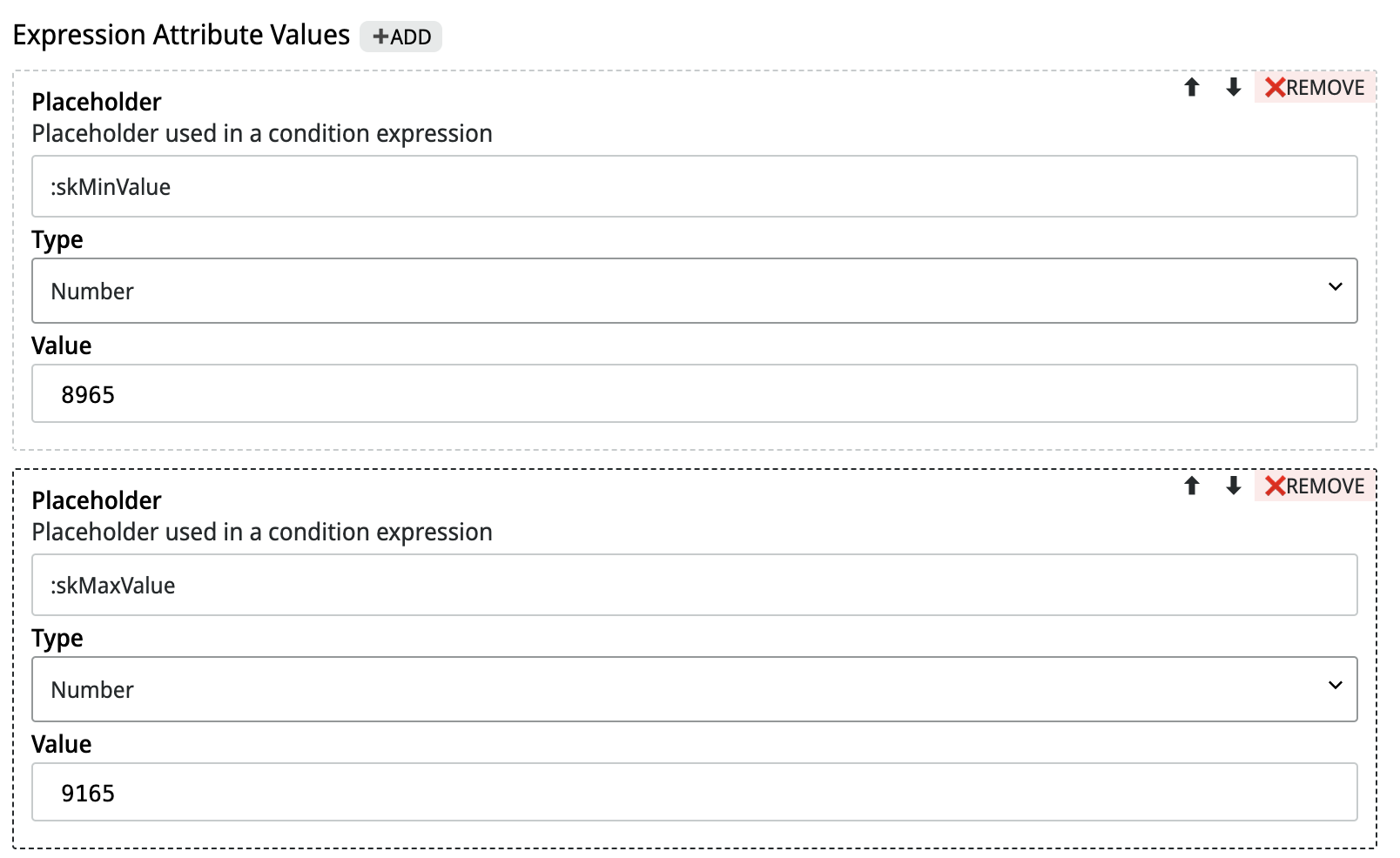 A list of attribute values used in the conditional expression fields (Sort Key Expression and Filter Expression). Each attribute value must specify the Placeholder used, the Type of the data, and the Value to replace the placeholder.