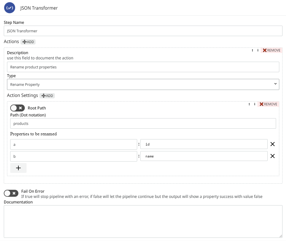<table data-full-width="true"><thead><tr><th>Parameter</th><th width="327">Description</th><th>Default value</th><th>Data type</th></tr></thead><tbody><tr><td><strong>Actions</strong></td><td>Add or remove different actions.</td><td>N/A</td><td>Options of Actions</td></tr><tr><td><strong>Description</strong></td><td>This field is used to document the action.</td><td>N/A</td><td>String</td></tr><tr><td><strong>Type</strong></td><td>Set the action that will be executed, such as: <strong>Rename Property</strong>, <strong>Edit Property</strong>, <strong>Remove Property</strong>, and <strong>Remove Property with Condition</strong>. See more details about each action in the section below.</td><td>Rename Property</td><td>String</td></tr><tr><td><strong>Action Settings</strong></td><td>Additional settings related to the selected action.</td><td>N/A</td><td>Options of Action Settings</td></tr><tr><td><strong>Root Path</strong></td><td>Must be activated when the JSON property is in the root of the object. When this option is activated, <strong>Path (Dot Notation)</strong> is not available.</td><td>False</td><td>Boolean</td></tr><tr><td><strong>Path (Dot notation)</strong></td><td>Must be filled when the JSON property isn't in the root of the object. It allows indicating dot notation, which makes it simple to access different JSON levels, including going through the JSON array and object.</td><td>N/A</td><td>String</td></tr><tr><td><strong>Properties to be renamed</strong> <code>(DB)</code></td><td>This parameter is shown only when action <strong>Rename Property</strong> is selected. Must be filled with the key and value you want to rename.</td><td>N/A</td><td>Key-value Pairs</td></tr><tr><td><strong>Values to be edited</strong> <code>(DB)</code></td><td>This parameter is shown only when action <strong>Edit Property</strong> is selected. Must be filled with the key and value you want to edit.</td><td>N/A</td><td>Key-value Pairs</td></tr><tr><td><strong>Properties to be removed</strong> <code>(DB)</code></td><td>This parameter is shown only when actions <strong>Remove Property</strong> or <strong>Remove Property with Condition</strong> are selected. Must be filled with the exact key name of the JSON (in case of <strong>Remove Property</strong>) or key and value you want to remove (in case of <strong>Remove Property with Condition</strong>).</td><td>N/A</td><td>String / Key-value Pairs</td></tr><tr><td><strong>Fail On Error</strong></td><td>If the option is activated, the execution of the pipeline with error will be interrupted; otherwise, the pipeline execution proceeds, but the result will show a false value for the “success” property.</td><td>False</td><td>Boolean</td></tr></tbody></table>
