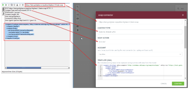 SOAP V1 invokes SOAP endpoints from a pipeline. It uses a Apache FreeMarker template to generate the SOAP request message and converts the response from SOAP to JSON, trying its best not to disrupt the translation.