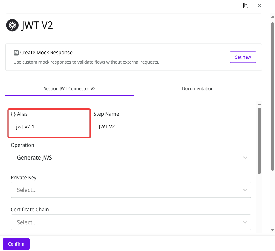 When configuring a connector or capsule, you can define a **Step Alias**. This allows you to reference data in subsequent steps that support Double Braces. See below an example using the **JWT V2** connector and a **cpf-cnpj-validator** capsule: