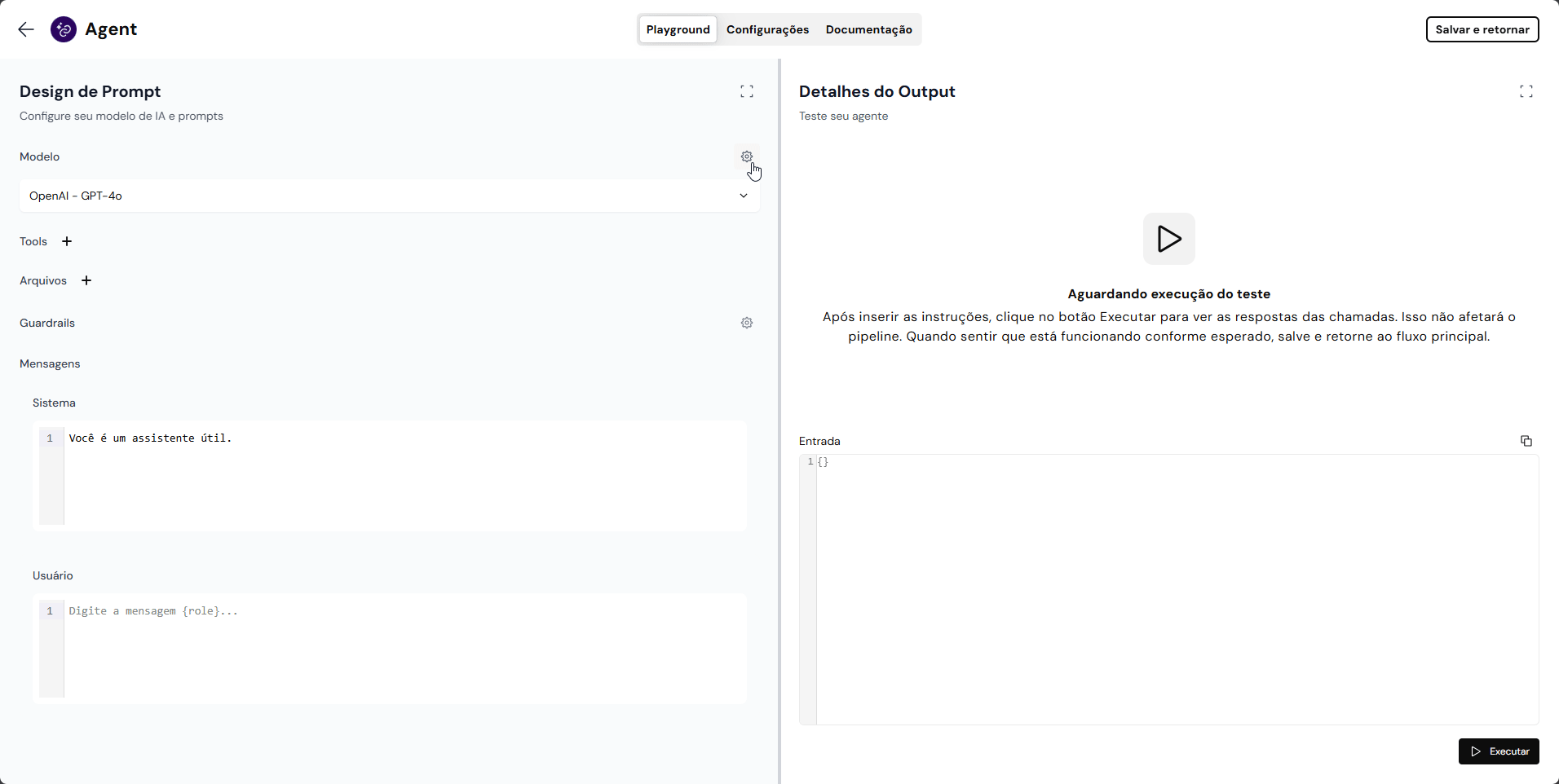 * **Mensagem do Usuário**: O prompt em si. Você pode injetar dados do pipeline usando Double Braces.