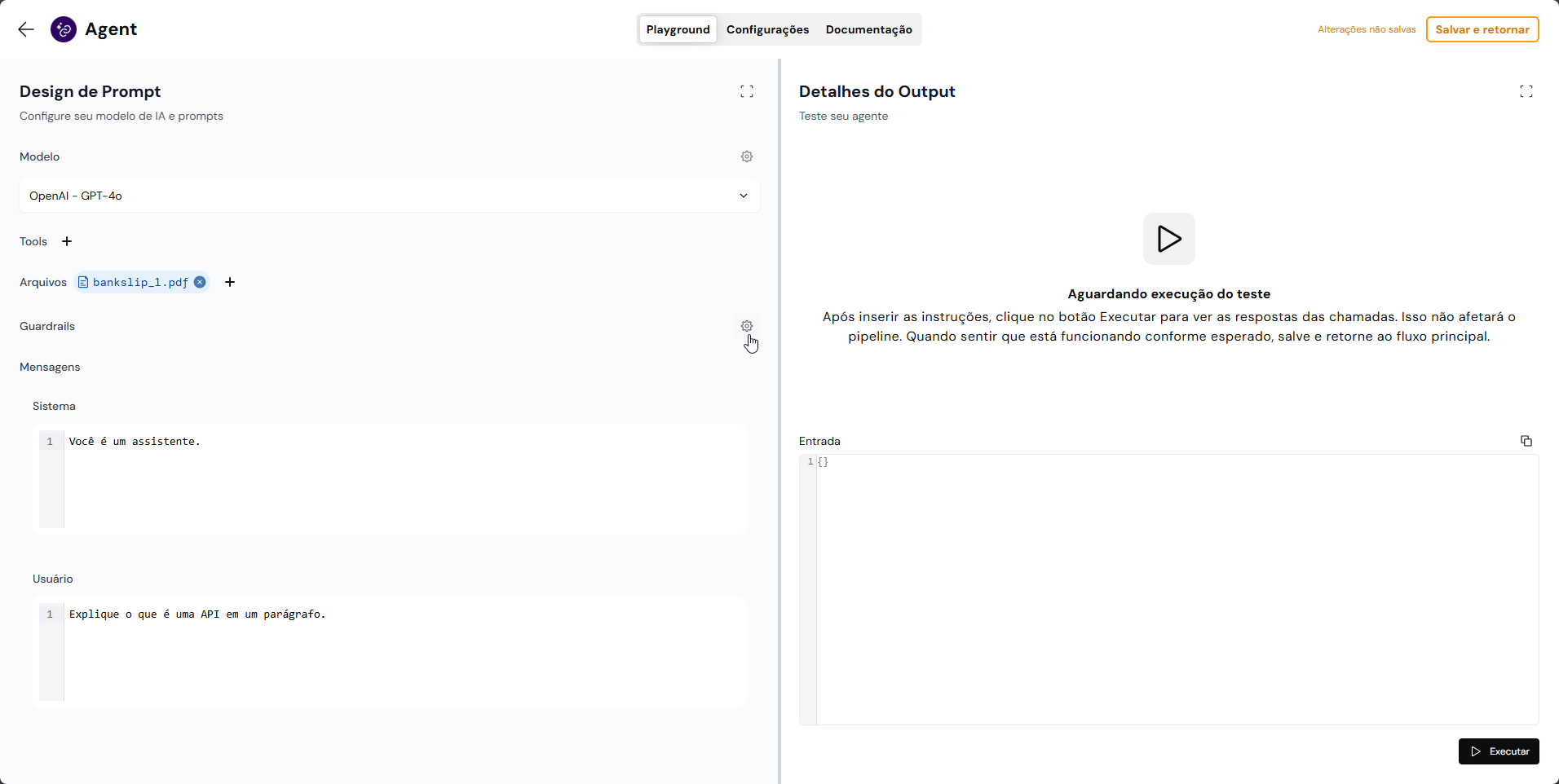 Cada execução consome tokens do seu provedor. Para reduzir o uso ao testar o pipeline completo, considere adicionar uma [**resposta mock**](#configure-uma-resposta-mock).