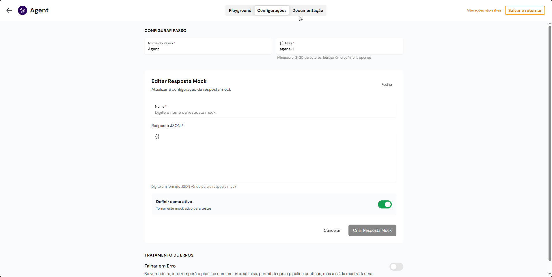 3. Insira o JSON da resposta mock no campo **Resposta JSON**.