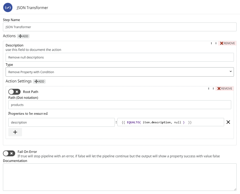 O componente JSON Transformer possibilita a aplicação de transformações no JSON que está sendo processado dentro do seu pipeline. Você pode realizar uma série de ações utilizando um formulário de configurações.