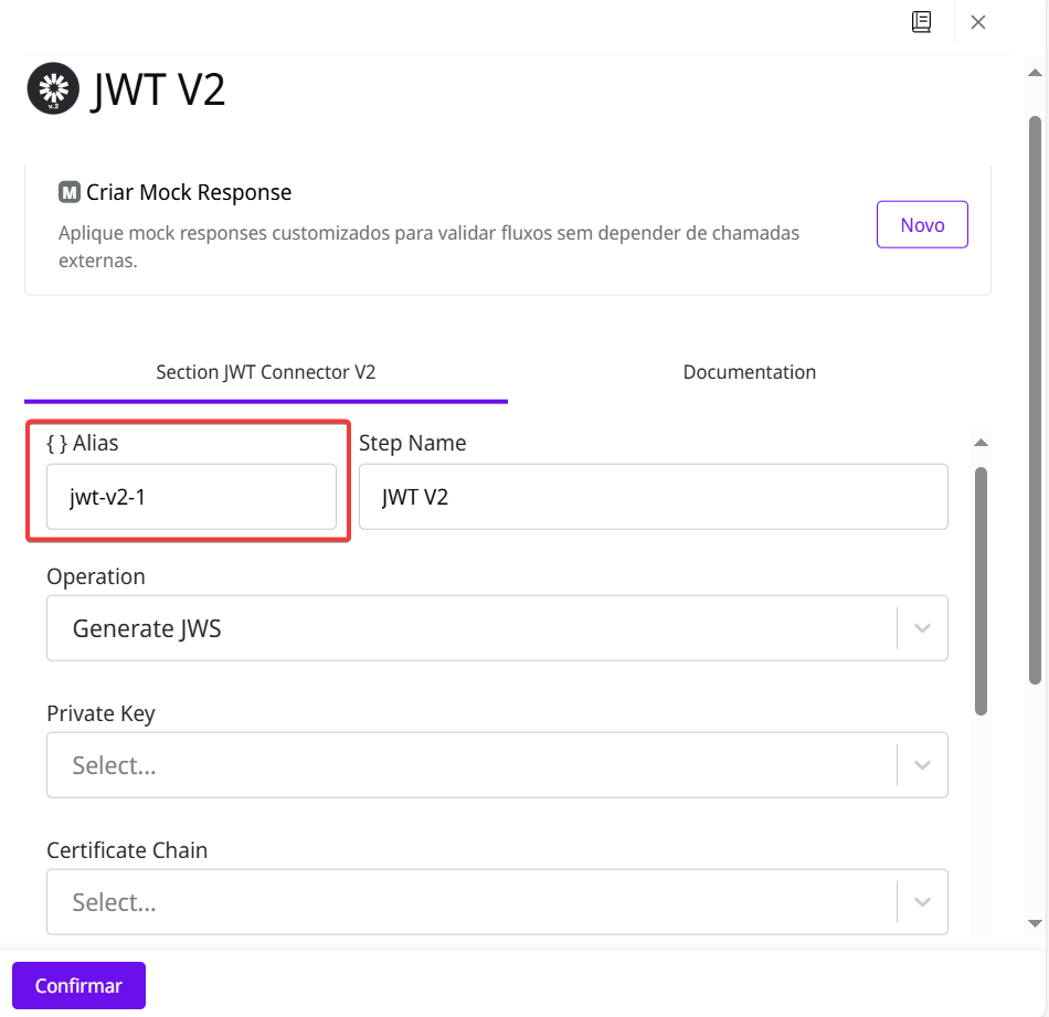 Ao configurar um conector ou cápsula, você pode definir um Step Alias. Isso permite referenciar os dados em passos subsequentes que suportam expressões Double Braces. Veja abaixo um exemplo usando o conector JWT V2 e uma cápsula de validação (cpf-cnpj-validator):