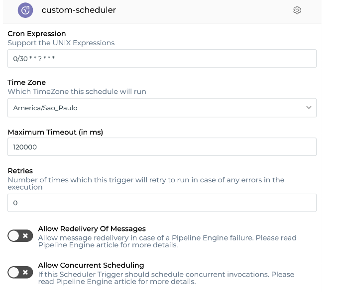 Quando um pipeline é configurado e publicado com qualquer variável do Scheduler Trigger, é criada uma função para executar o processo em pausas predefinidas. Isso é feito seguindo uma expressão cron definida nas configurações deste tipo de trigger.