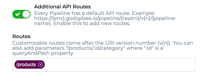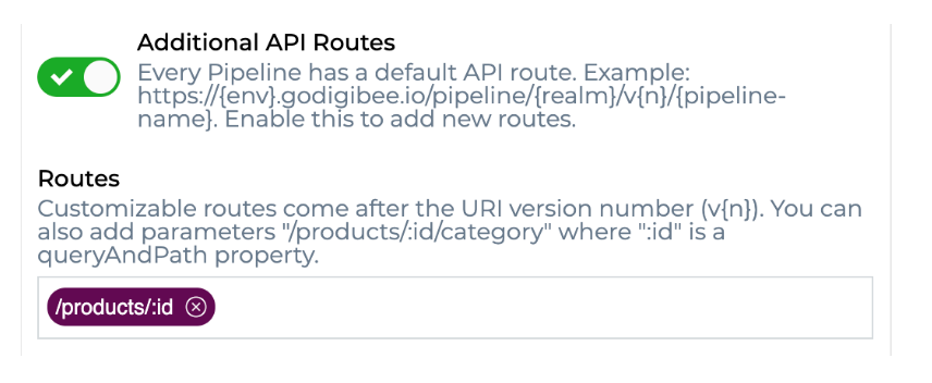 When removing the default prefix and setting the pipeline route through the Additional API Routes parameter, be careful not to set an existing pipeline route used by other pipelines. In case you have more than one pipeline major version, it’s also important to keep in mind that the pipeline route versioning must be done by the user due the absence of a versioning path parameter. For example: /pipeline/realm/v1/.