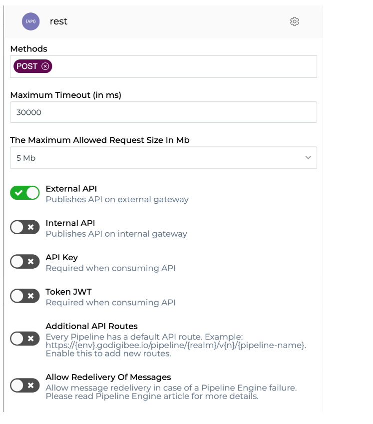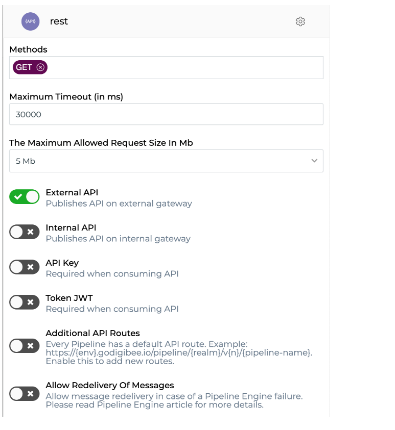 The pipeline can have both the External API and Internal API options enabled at the same time, but it is recommended to leave them inactive. This parameter does not support API Key, JWT, or Basic Auth.