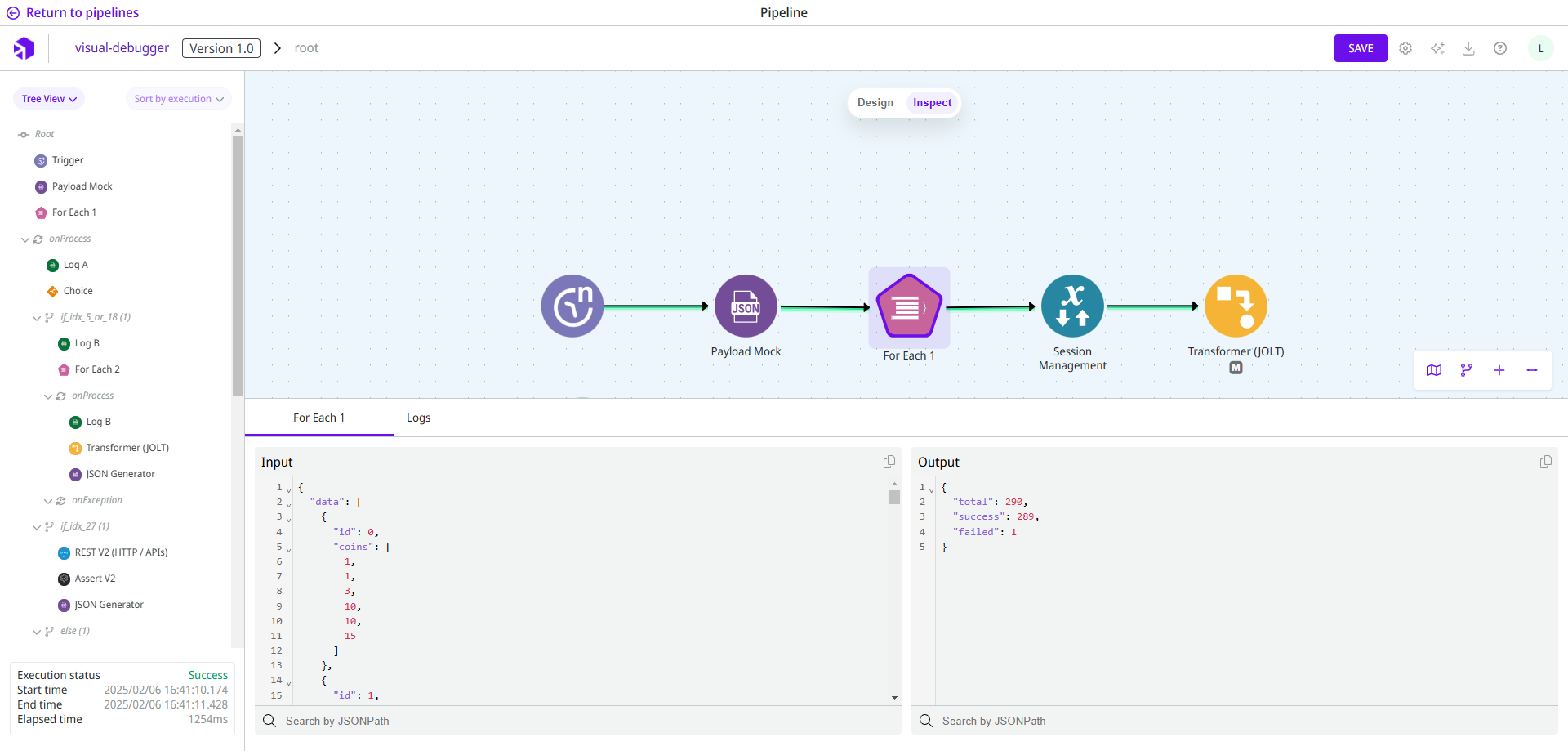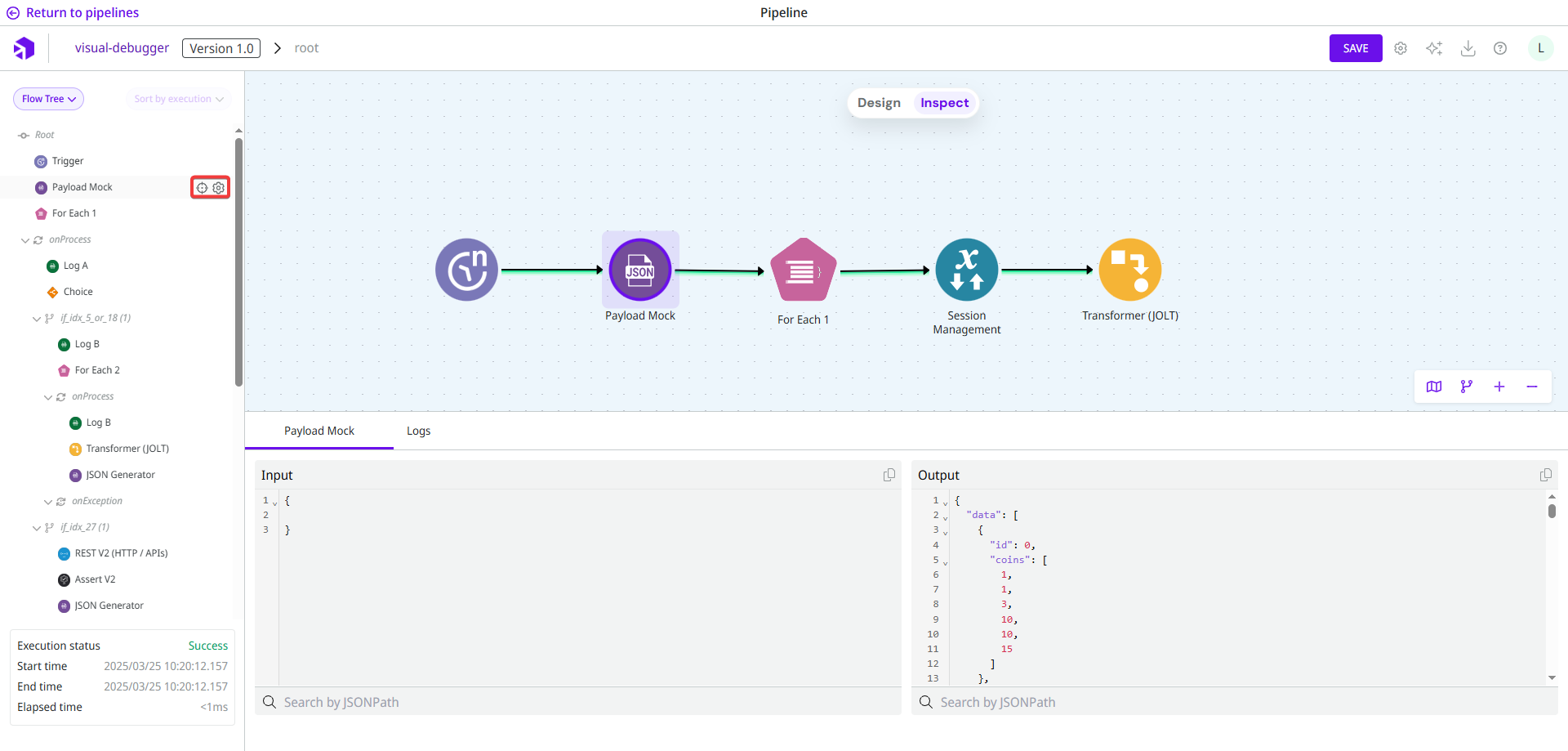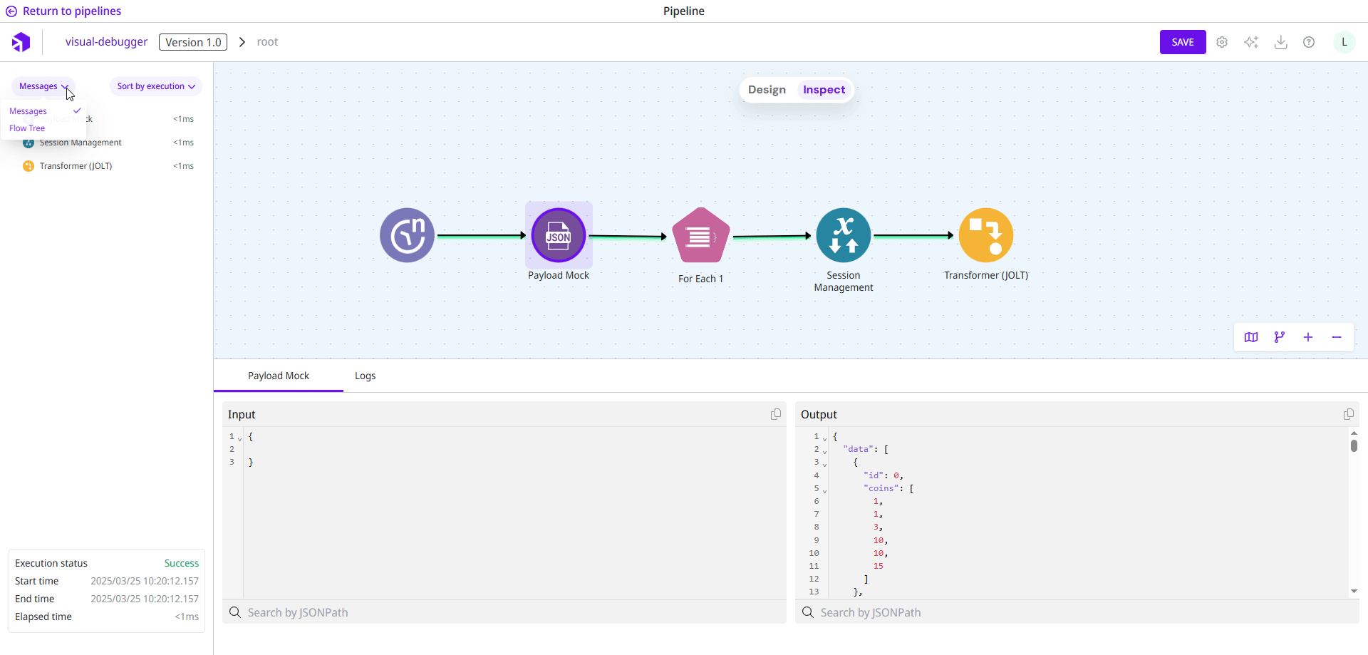 To activate the Inspect Mode, you must open the [Execution panel](https://docs.digibee.com/documentation/developer-guide/development-cycle/build-overview/canvas/execution-panel) in Design Mode and run the flow. The Inspect Mode is activated when messages are present in the execution. A notification is displayed on the page to let you know that an execution is ready for inspection.