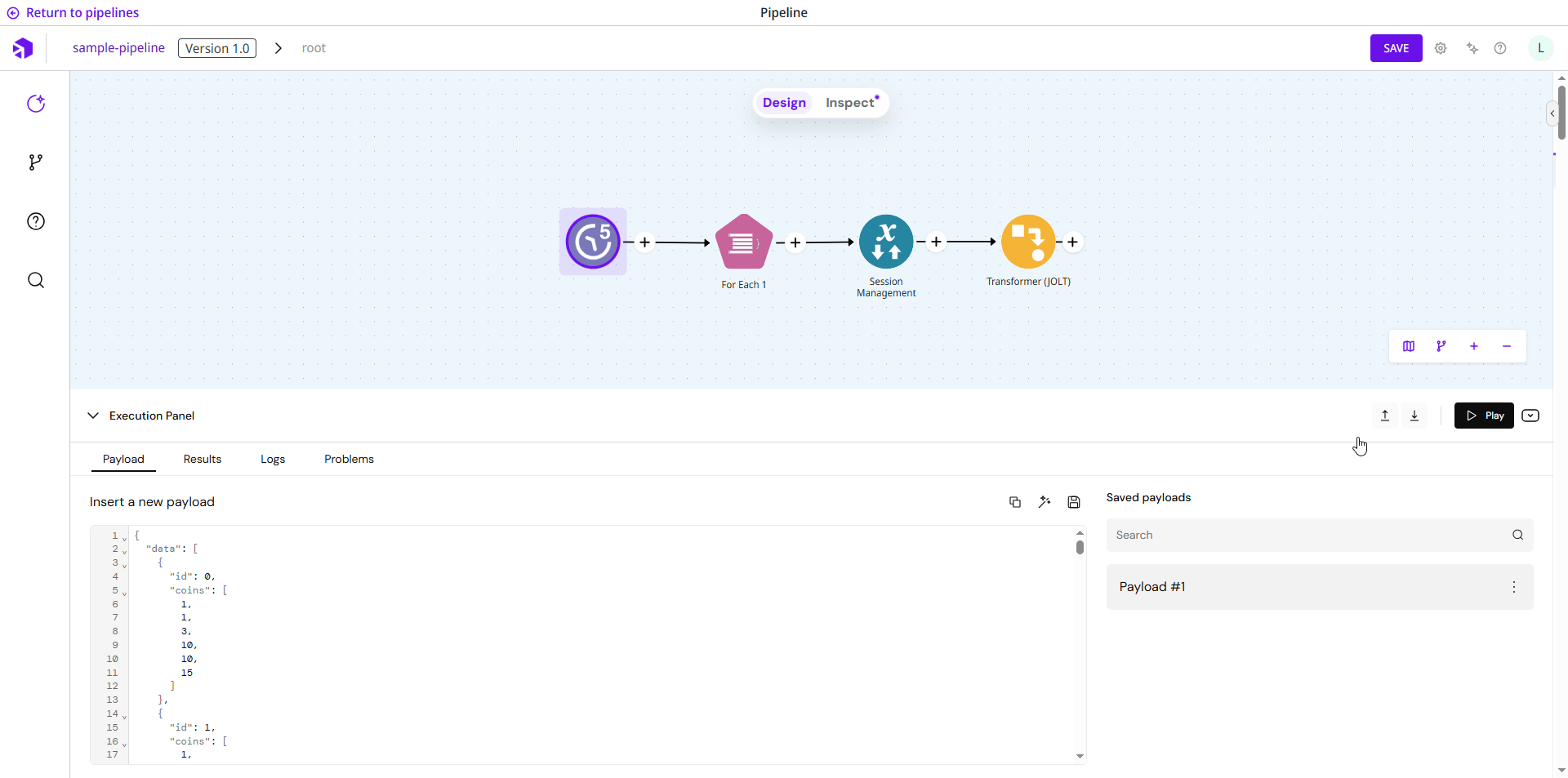 * **Save the payload:** You can save a payload for later use. Click the **save icon** and assign a name to it. Saved payloads are specific to each pipeline or capsule and are not shared across different flows.