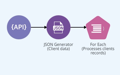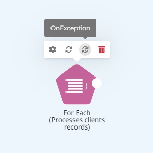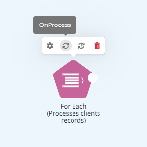 To iterate through the collection of records, we'll use the For Each (Processes clients records) component.