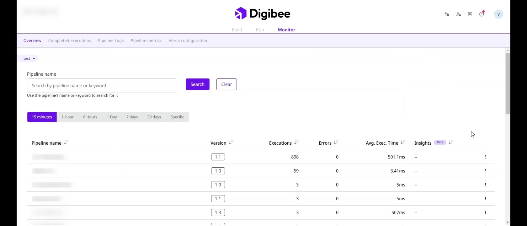 You can also click on the three-dot icon in the end of each row of the table to see the Completed executions, Logs, Metrics or Alerts pages for the selected pipeline. These pages are already filtered to show only the data relevant to the pipeline you have selected, making it easier to see specific information.