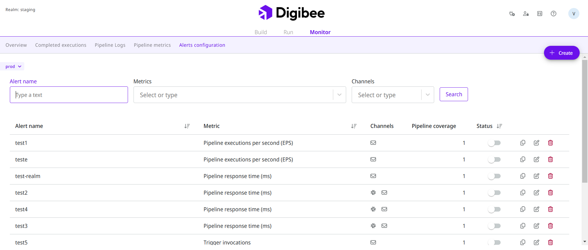 Pipeline coverage: The selected pipelines with the alert. If all pipelines in the realm are selected, they will be indicated with All in the table row.