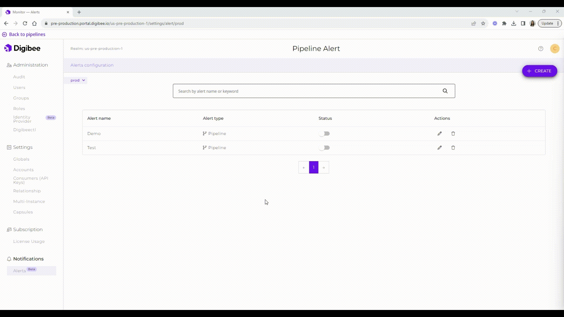 When an alert is created in the Digibee Integration Platform, it is set to disabled by default. In order for it to start monitoring and generating notifications, it must be manually enabled. Follow these steps to enable or disable an alert: