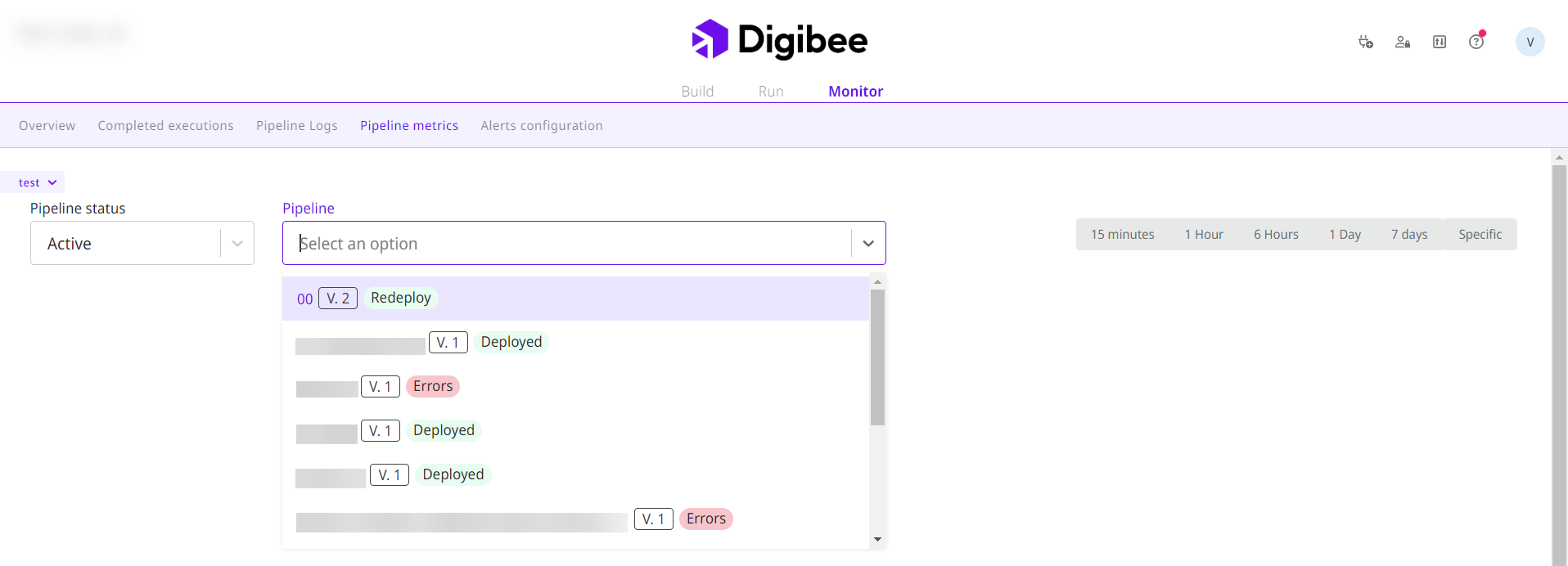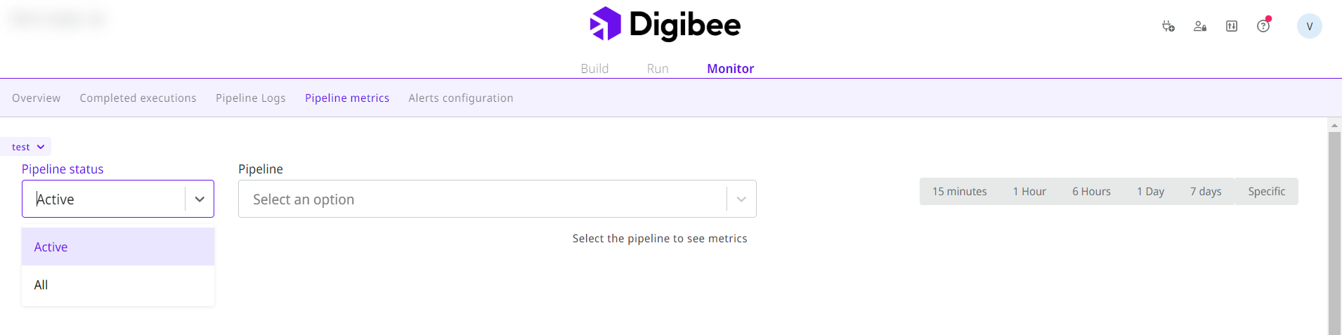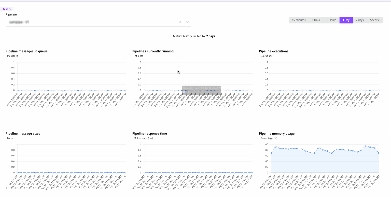 4. When you select a pipeline, the platform displays the 15-minute filter by default. You can change the reporting period by choosing between 15-minute, 1-hour, 6-hour, 1-day and 7-day intervals, or set a specific time range as desired.