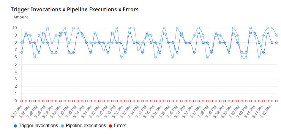 <figure><img src="https://content.gitbook.com/content/jvO5S91EQURCEhbZOuuZ/blobs/HIf55QT1PkcZDfBHqppB/TriggerxPipelinesxErrors.png" alt=""><figcaption><p>Trigger invocations x Pipeline executions x Errors chart on the Pipeline Metrics page</p></figcaption></figure>
