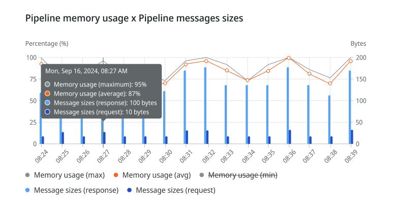 <figure><img src="https://content.gitbook.com/content/jvO5S91EQURCEhbZOuuZ/blobs/bfd1CqNN9h9pjH3NHKuI/pipeline-message-sizes.png" alt=""><figcaption><p>Pipeline message sizes chart on Pipeline Metrics page</p></figcaption></figure>