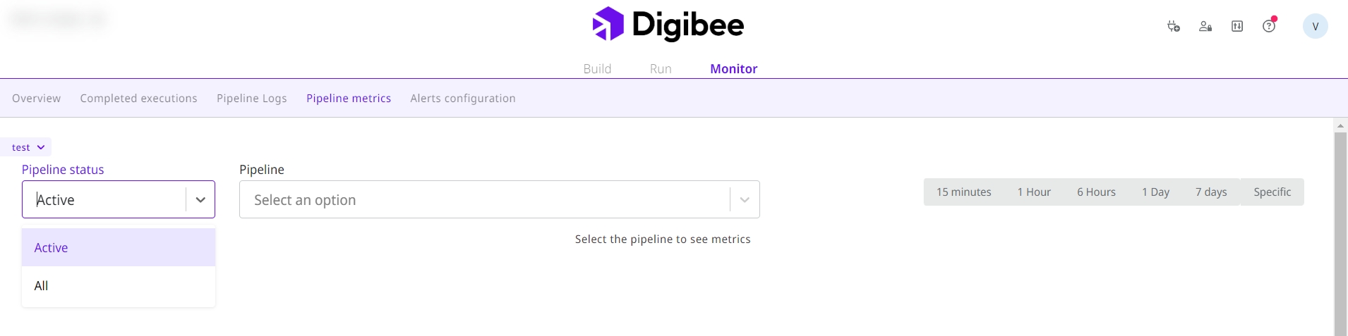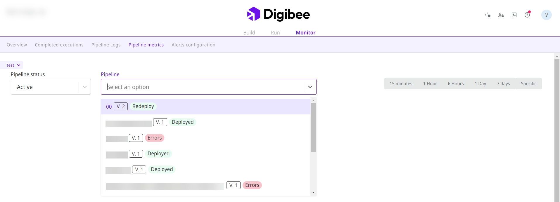 When you select a pipeline, the platform displays the 15-minute filter by default. You can change the reporting period by choosing between 15-minute, 1-hour, 6-hour, 1-day and 7-day intervals, or set a specific time range as desired.