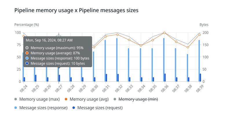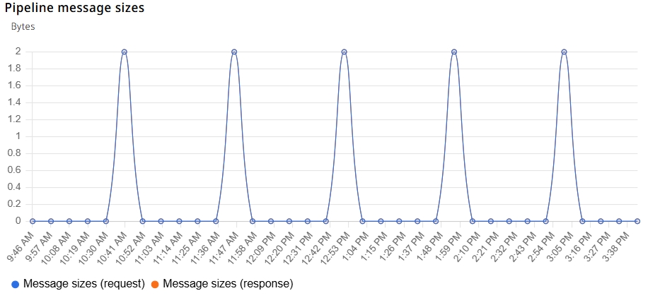 The lines in this chart show the average request and response message size in bytes for all pipeline replicas, for many intervals in the selected time period. You can see the line's label by hovering the cursor over it.