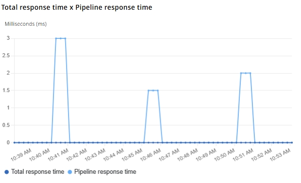 This chart compares the pipeline processing time (pipeline response time) with the total pipeline response time, which includes the trigger invocation and time spent in the request queue.