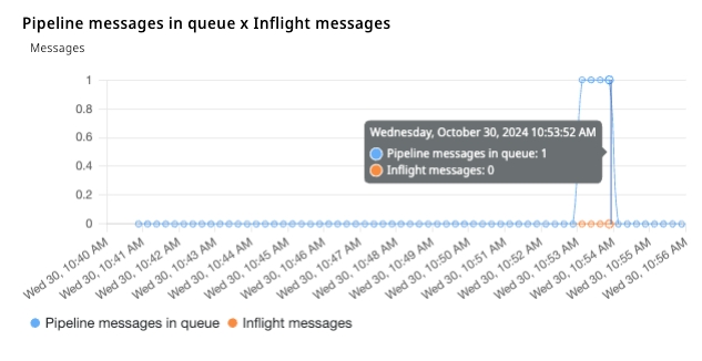 This chart shows the number of messages in the queue compared to the number of concurrent executions in progress. This allows you to identify possible delays in processing messages. These delays can occur when the number of replicas is not enough to keep up with the demand generated by consumers.