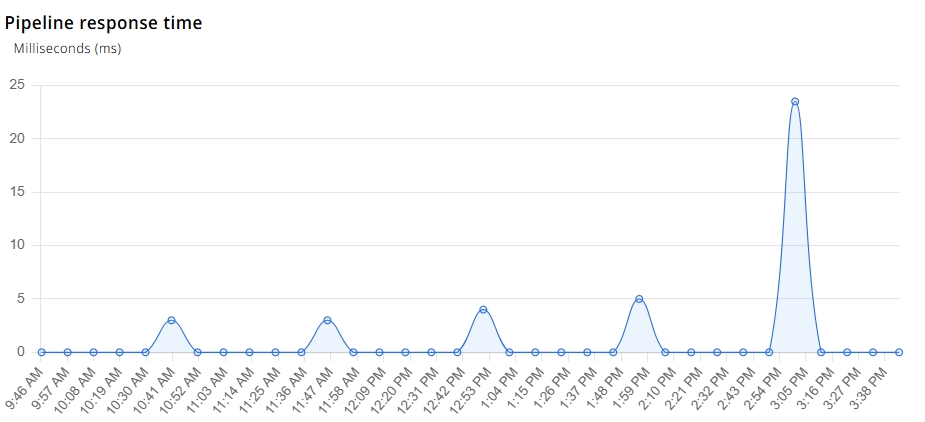 This chart shows the average time (in milliseconds) the pipeline took to generate a response for many time intervals over the selected period for all replicas. The response time is given by the elapsed time between the message leaving the execution queue and the pipeline generating a response. Containments in the execution queue do not affect this metric.