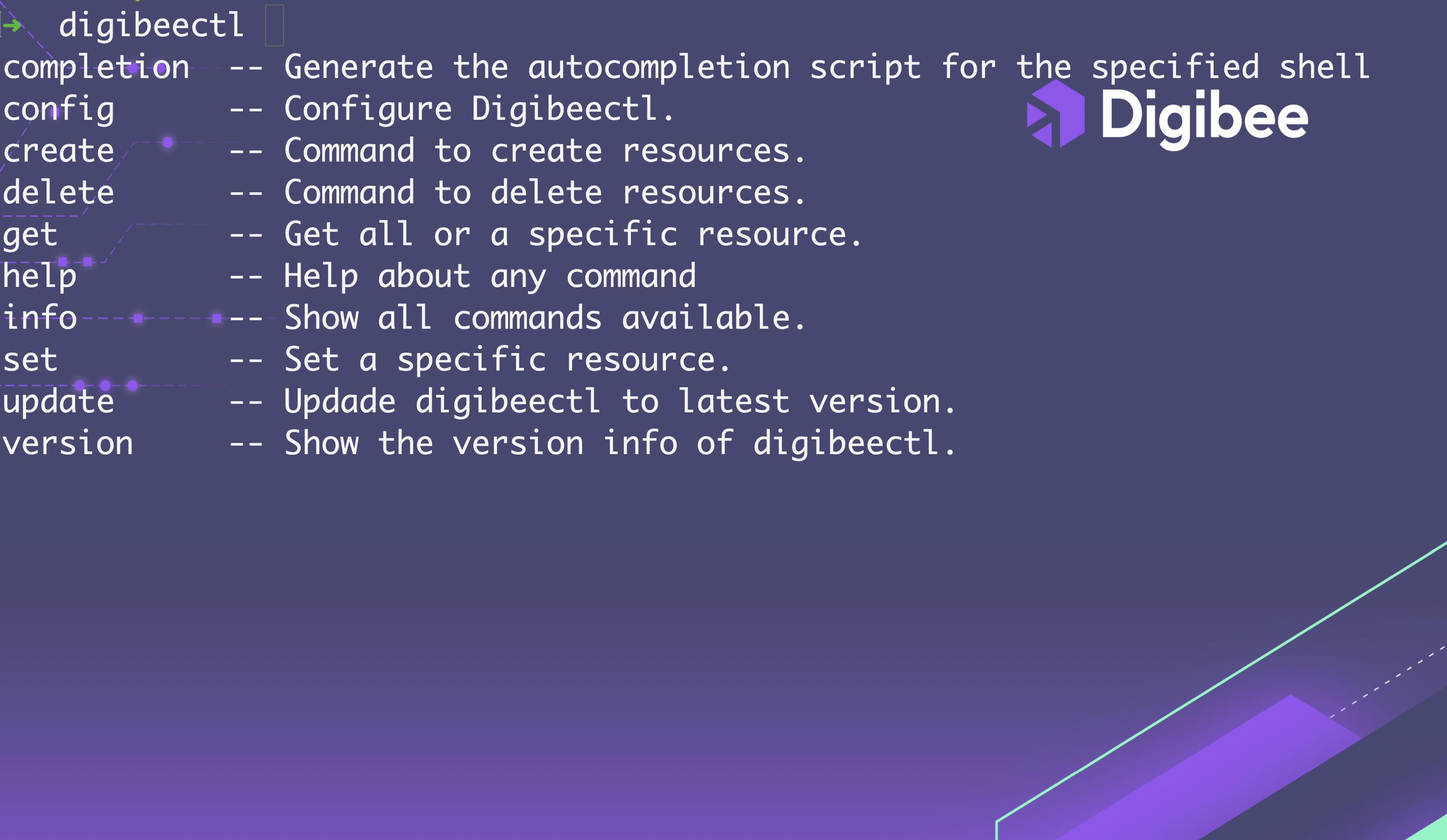 <table data-full-width="true"><thead><tr><th>Operation</th><th>Syntax</th><th>Description</th></tr></thead><tbody><tr><td>completion</td><td><code>digibeectl completion SUB-COMMAND [flags]</code></td><td>Generate the autocompletion script for digibeectl for the specified shell.</td></tr><tr><td>config</td><td><code>digibeectl config [flags]</code></td><td>Configure digibeectl.</td></tr><tr><td>create</td><td><code>digibeectl create RESOURCE [flags]</code></td><td>Command to create resources</td></tr><tr><td>delete</td><td><code>digibeectl delete RESOURCE [flags]</code>   </td><td>Command to delete resources</td></tr><tr><td>get</td><td><code>digibeectl get RESOURCE [flags]</code></td><td>Get all resources or a specific resource.</td></tr><tr><td>help</td><td><code>digibeectl get SUB-COMMAND or RESOURCE [flags]</code>   </td><td>Help about any command.</td></tr><tr><td>info</td><td><code>digibeectl info [flags]</code>  </td><td>Show all commands available.</td></tr><tr><td>set</td><td><code>digibeectl create RESOURCE [flags]</code></td><td>Set a specific resource.</td></tr><tr><td>update</td><td><code>digibeectl update [flags]</code></td><td>Update digibeectl to the latest version.</td></tr><tr><td>version</td><td><code>digibeectl version [flags]</code></td><td>Show the version info of digibeectl.</td></tr></tbody></table>