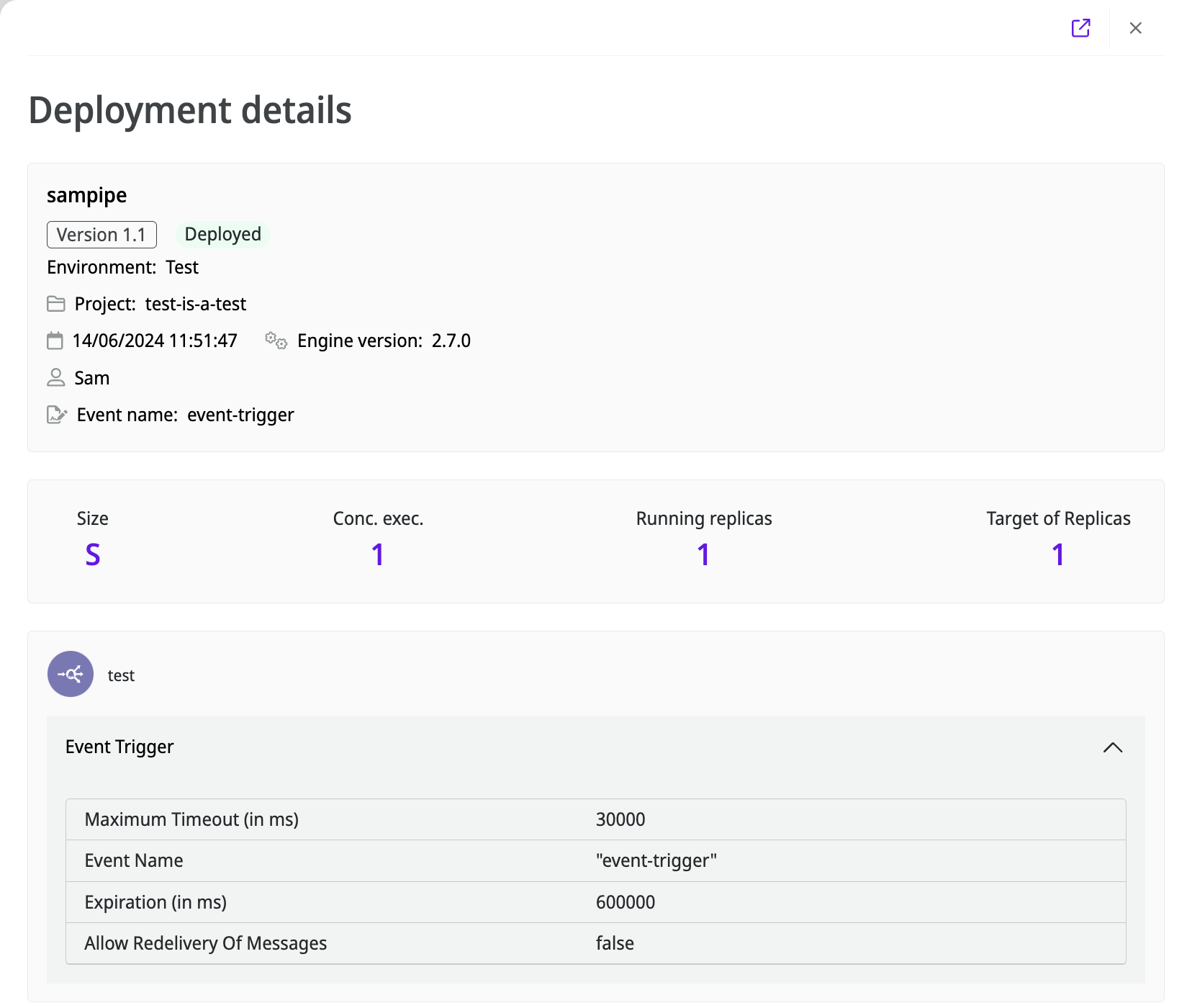 Click on a new pipeline or select an existing one to check its deployment information displayed on a sidesheet. To access the trigger details you previously selected during the Build stage, click on the arrow icon in the right upper corner.