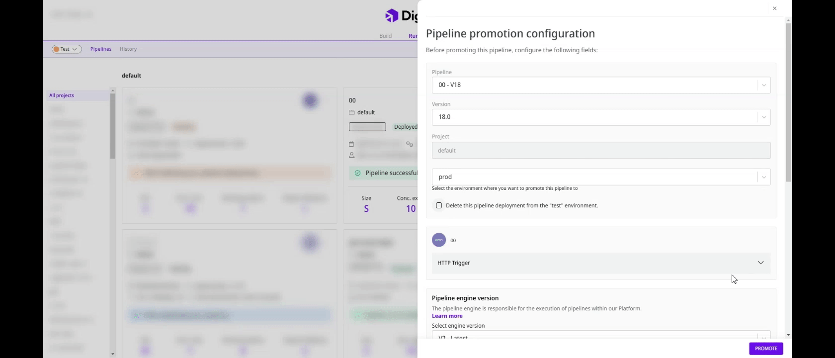 Promoting a previously deployed pipeline from a non-productive environment to another chosen environment is fast and simple. Here is how you can do that:&#x20;