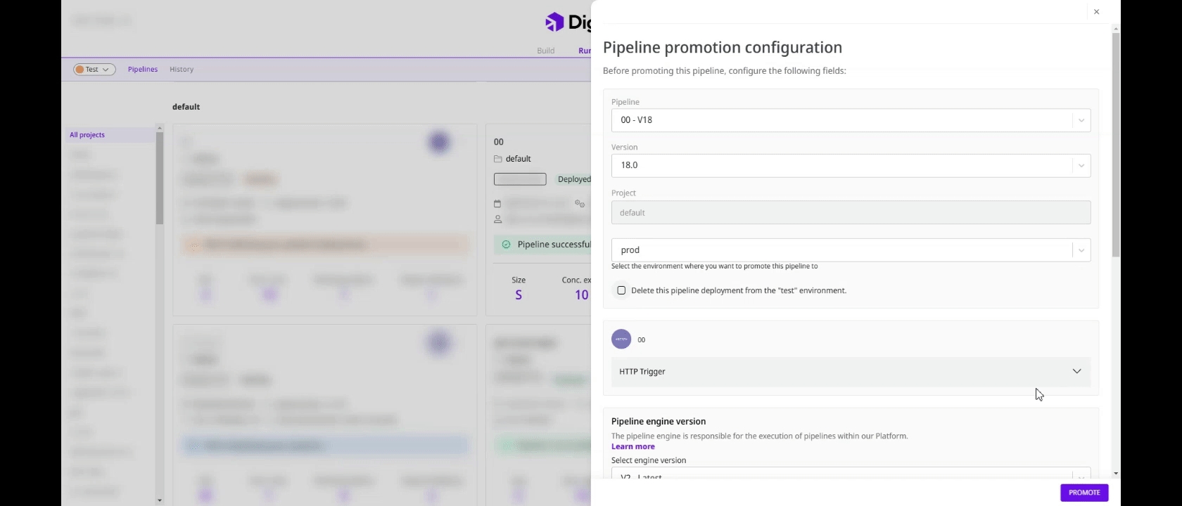 Promoting a previously deployed pipeline from a non-productive environment to another chosen environment is fast and simple. Here is how you can do that: