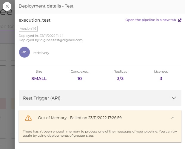 When you click on the pipeline card, below the Trigger information, a message is displayed that the pipeline needs to be redeployed at a larger size, which may resolve this issue.