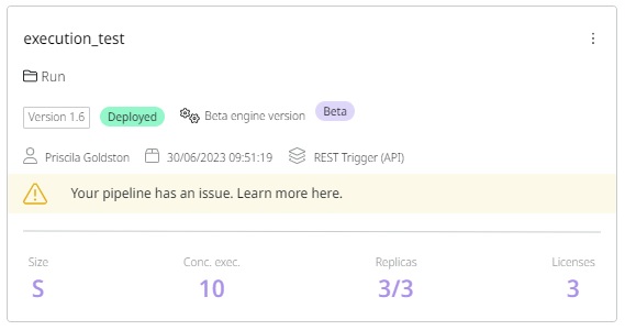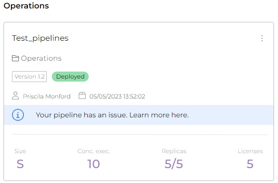 **Important:** When this information appears, the pipeline continues to operate normally. It is recommended to redeploy it so that the notification no longer appears on the card.