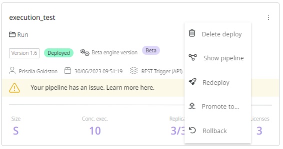 However, if the deployment date is older than the latest version, we recommend that you perform a redeployment to update the pipeline. Go to the pipeline card and click the three dots and then click Redeploy, as shown below.