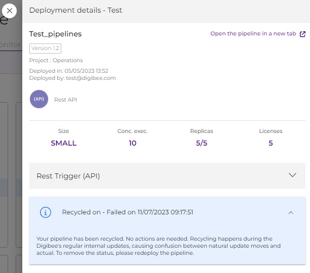 If you click on the pipeline card, after the Trigger information, you will see the following message: "Your pipeline has been recycled. No actions are needed. Recycling happens during the Digibee's regular internal updates, causing confusion between natural update moves and actual. To remove the status, please redeploy the pipeline."
