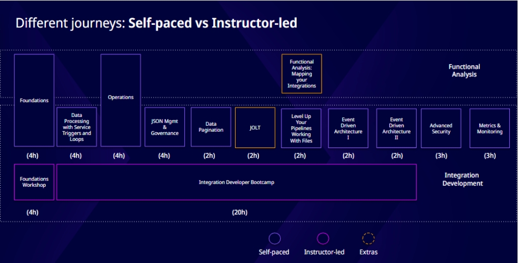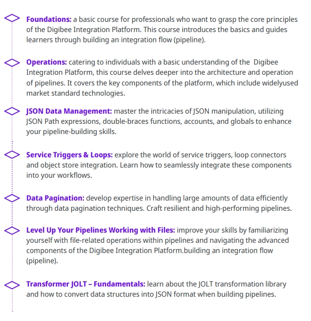 At Digibee Academy, our carefully curated training programs cater to a diverse range of learners, each designed to foster expertise in the field of integration. These programs cover a wide range of skills accommodating both those embarking on their integration journey and experienced professionals looking to expand their knowledge.