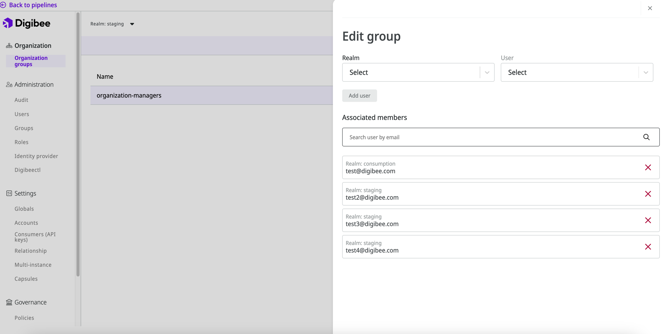 Select the realm where you want to add an Organization manager. Once selected, the email list of users with access to that realm will appear.