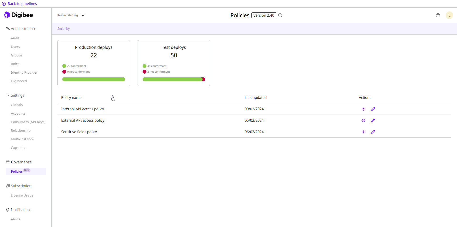 Our policies are applied to each pipeline deployed, taking into account its environment, be it test or production. Note that, when defining a policy, you must set values for all environments. It’s not possible to exclude one or more pipelines from any created policy.