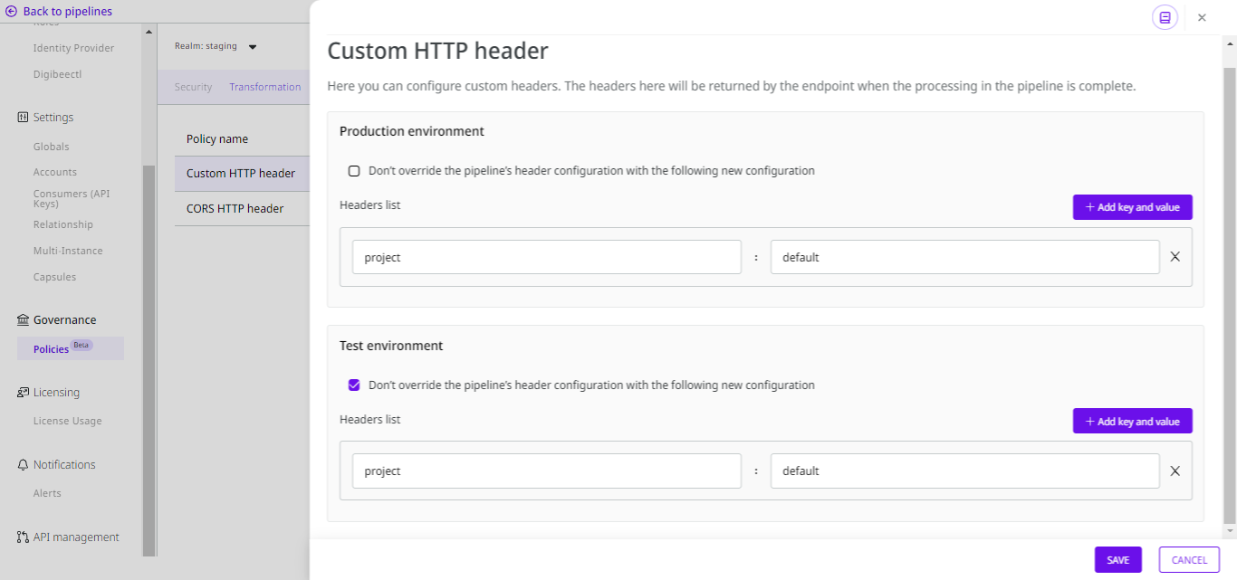 4. Open the **Custom HTTP header** policy. You will see a different configuration for each environment.