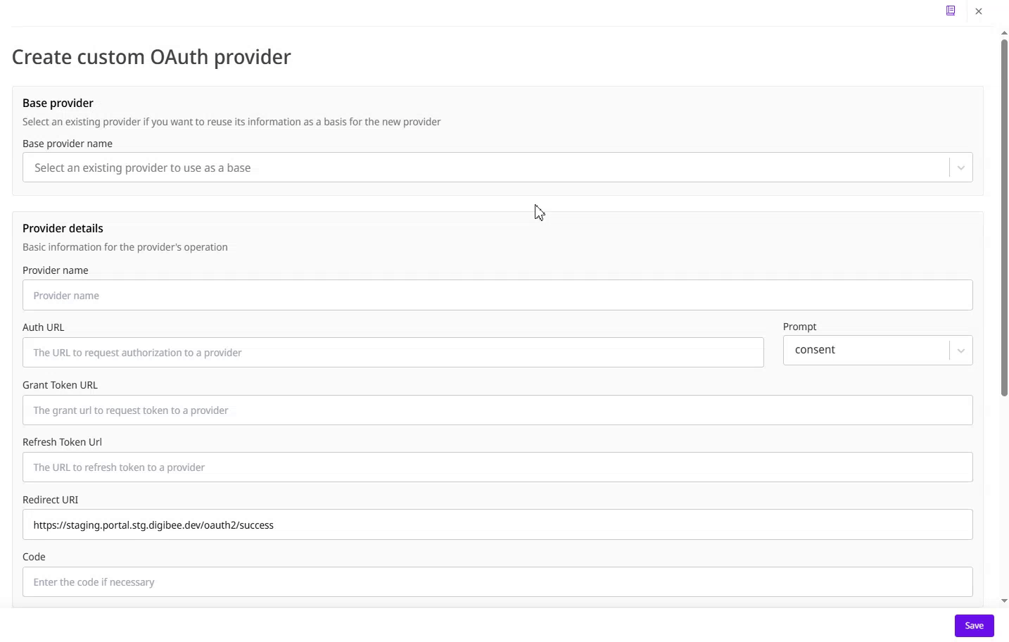 If you want to create a new provider based on an existing one, select the provider on the **Base provider field. The Auth URL, Grant Token URL, and Refresh Token URL information will be filled in automatically. You should include the Client ID, Client Secret, Scope,** and, if necessary, the **Code**.