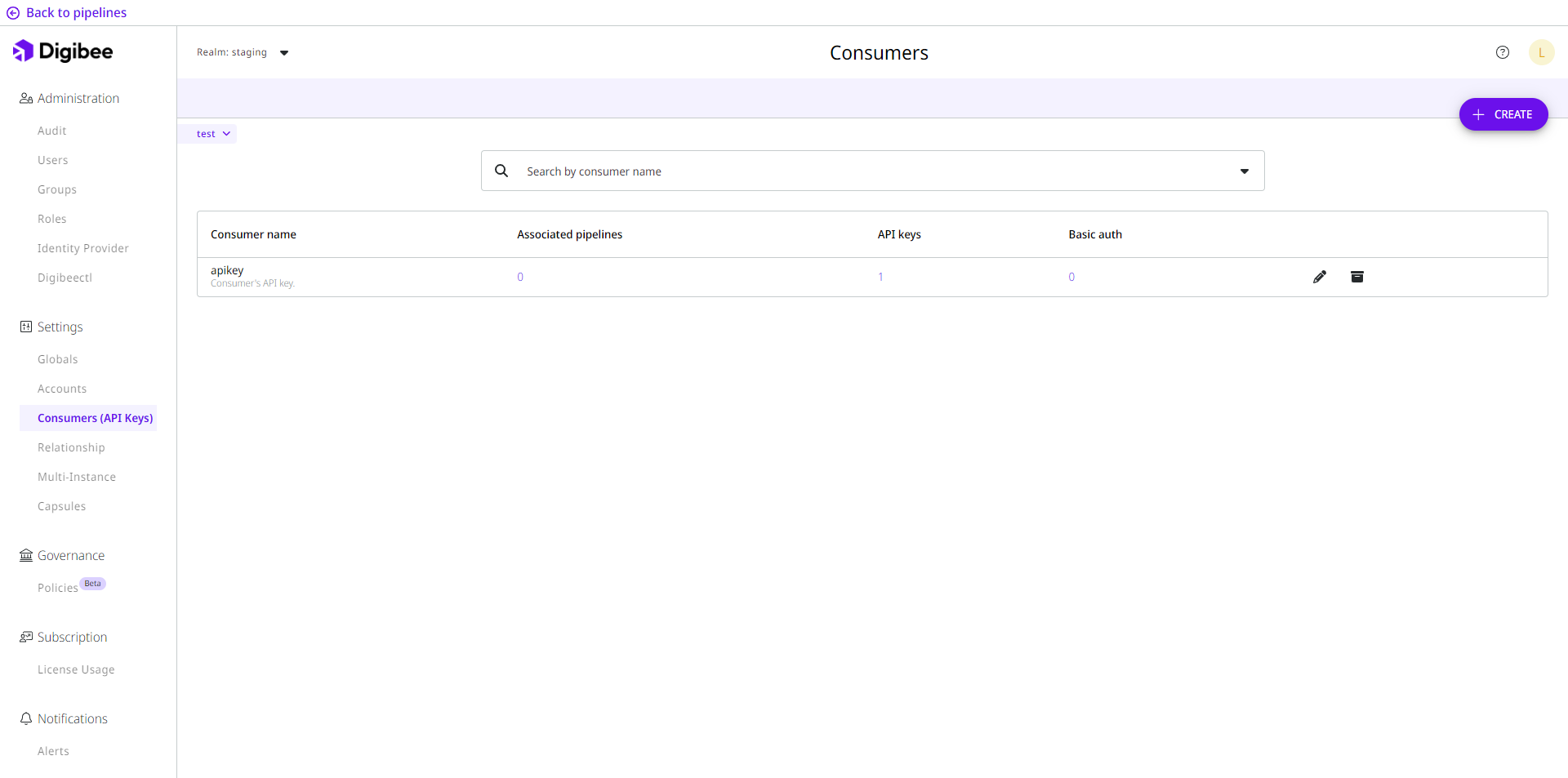 The Consumers, API Keys, and Basic Auth related to your pipeline can be found on the **Consumers (API Keys)** page, which is structured as follows: