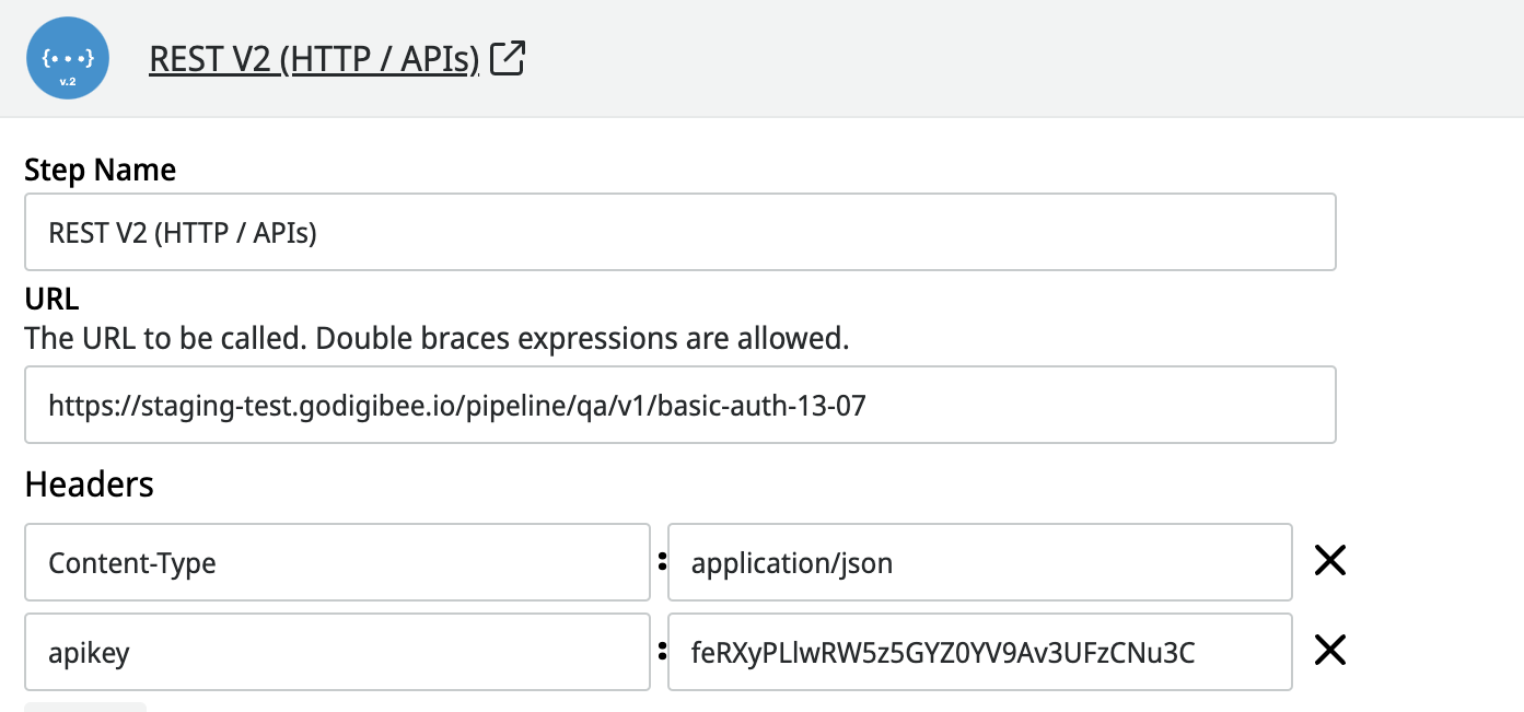 1. In the header, set the value of the key for the apikey parameter. Also, specify the Content-Type expected by the pipeline (example: application/json).