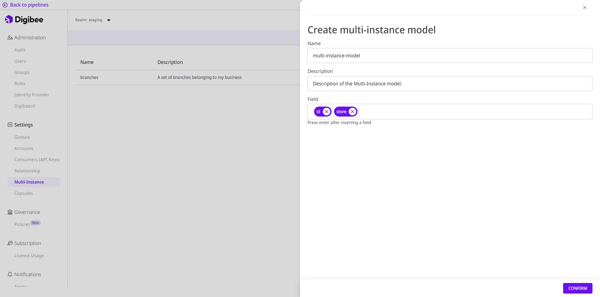 Before you create the instances, you need to create a multi-instance model. To do this, go to the Multi-Instance page, click Create, and define a name, description, and the fields of the instances, that is, the variables that should receive values in each environment.