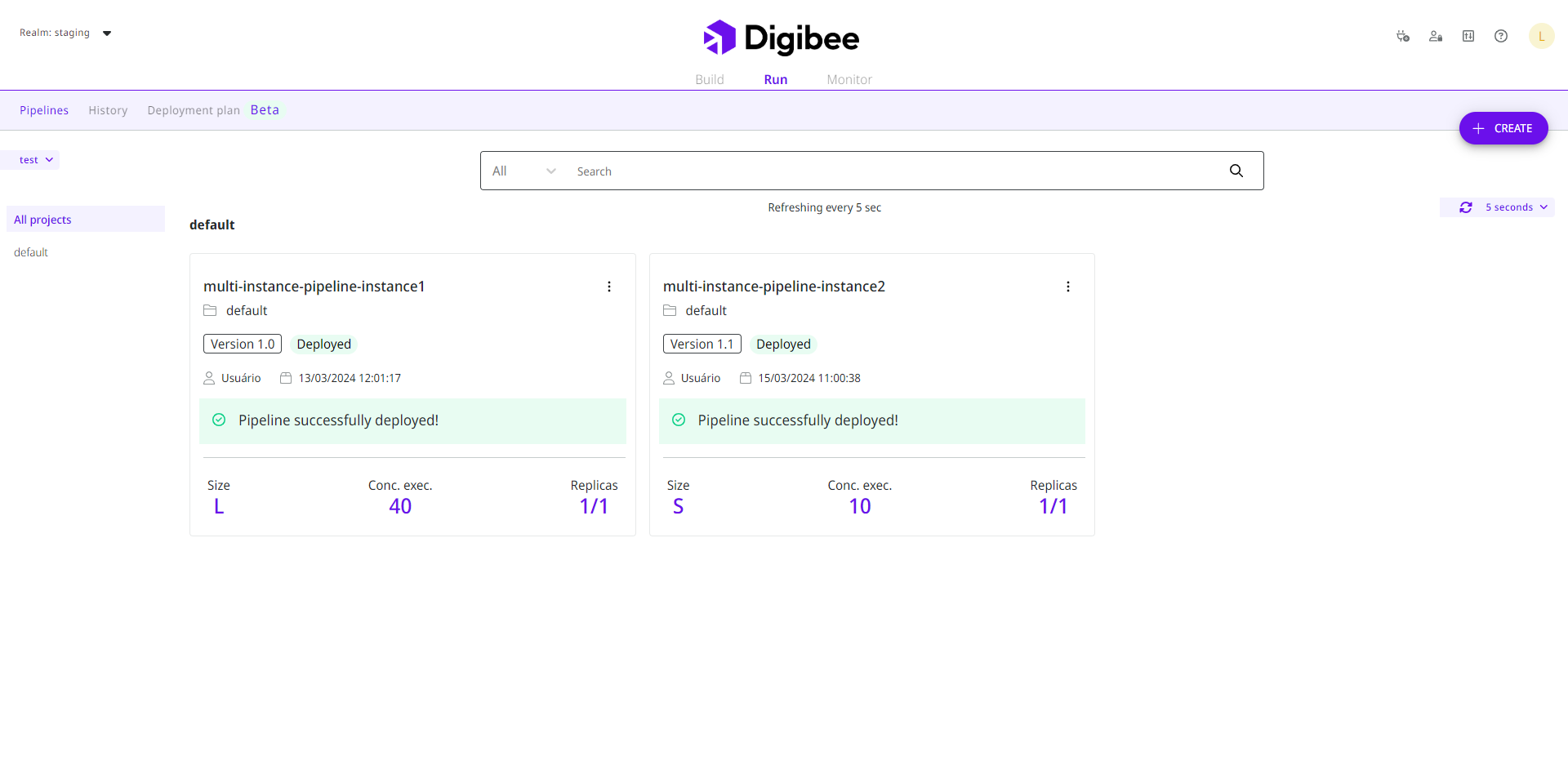 Below is the “multi-instance-pipeline” already deployed on "instance1" and "instance2" instances in the Run phase shown in the pipeline card: