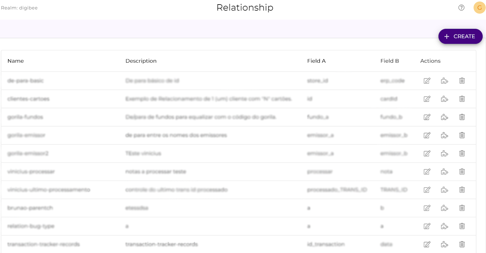 On the Digibee Integration Platform settings page, the Relationship submenu provides a list of all relationship models that have already been created in the Platform, as well as their configuration parameters. In addition, you can edit and delete existing Relationships and query data from connected entities via actions.