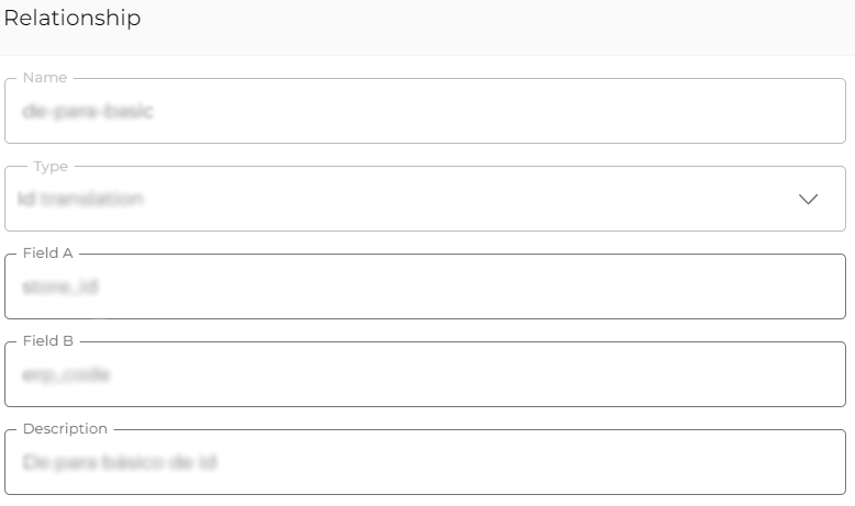 This action allows you to edit any configuration parameters that were defined when the new Relationship was created. These are: Name, Type (ID translation, Parent child, ID translation no overwrite), Field A, Field B, and Description.