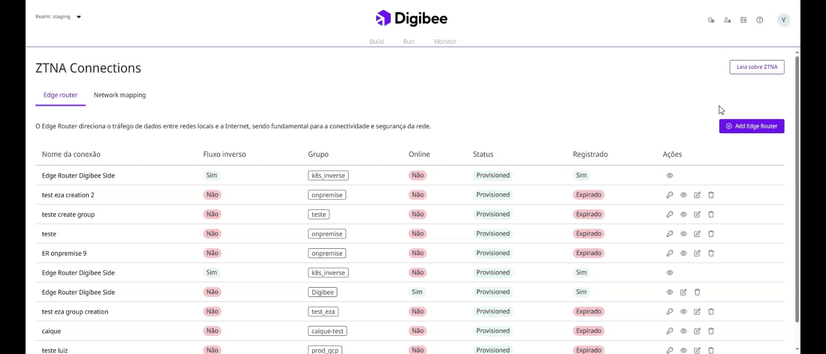 Você pode configurar novas conexões (Edge Router) em ZTNA no página de Conectividade da Plataforma Digibee, o que te dá mais controle sobre sua rede.