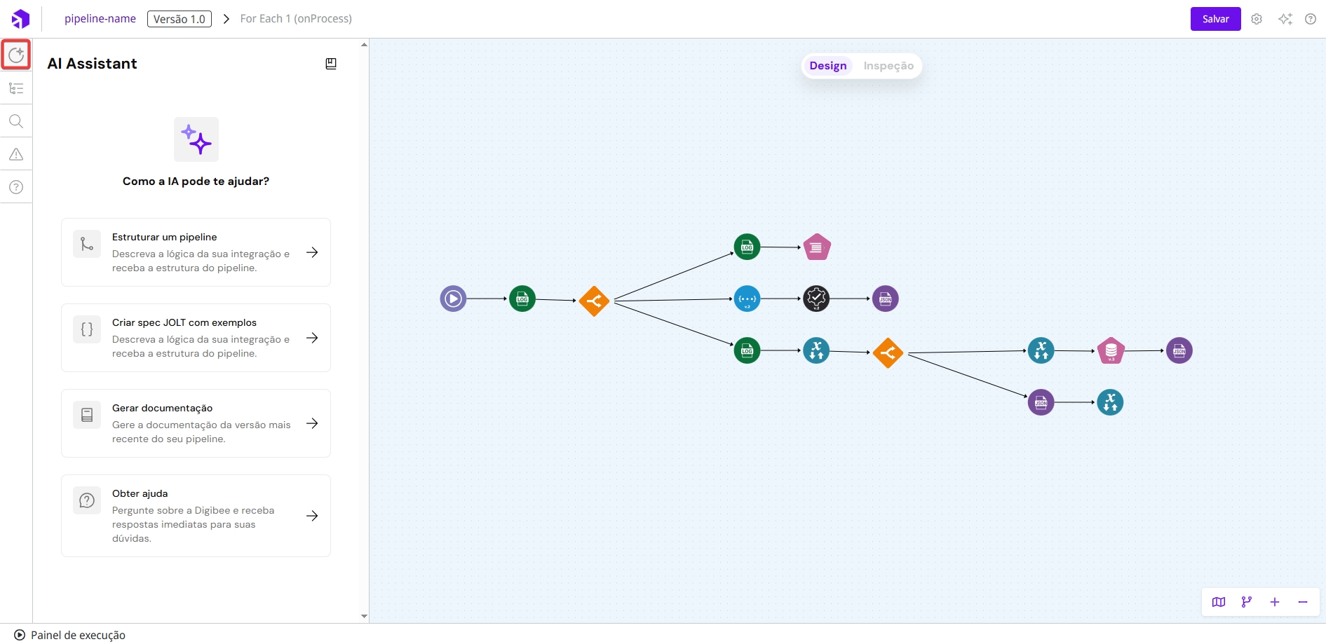 Informe um prompt descrevendo a lógica da sua integração e receba uma estrutura de pipeline em troca. Isso inclui: