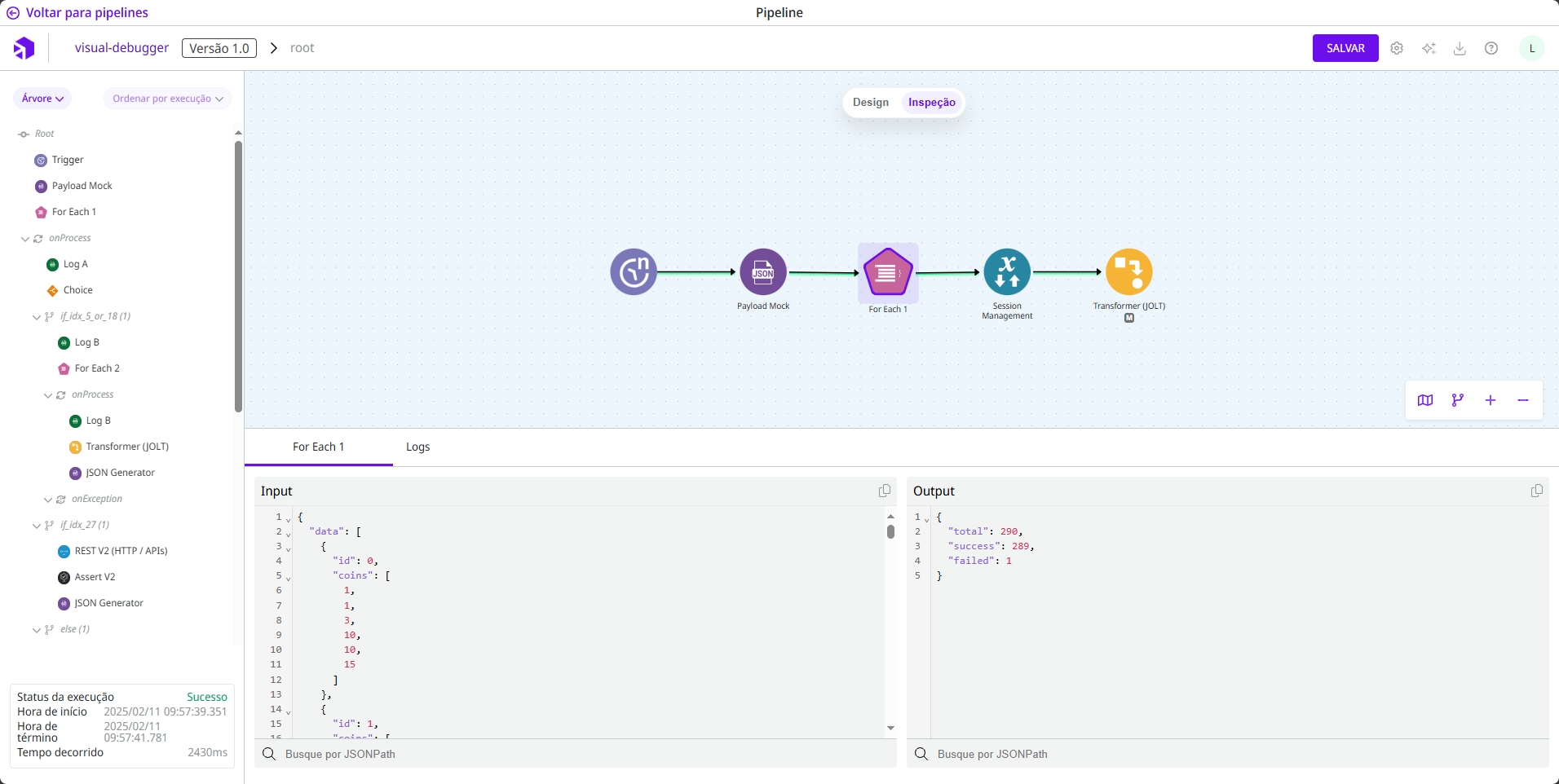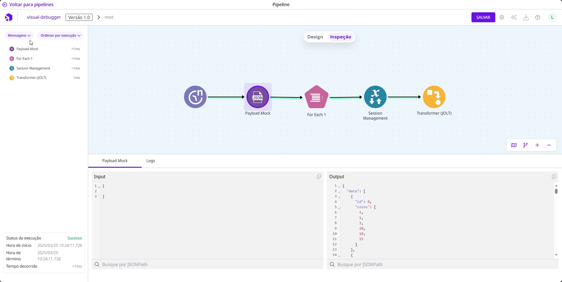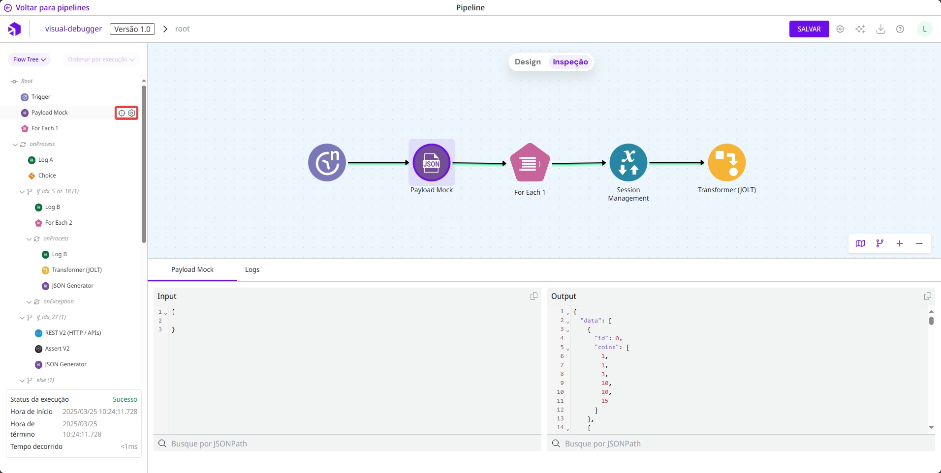 Uma vez executado o fluxo, você deve clicar no botão Inspeção na parte superior da tela para entrar no Modo de Inspeção, conforme a imagem abaixo.