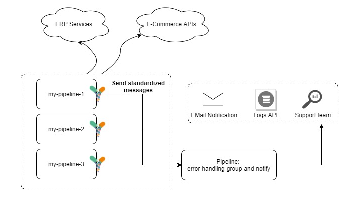 No caso de integração de produtos, os erros do ERP devem ser separados dos erros da plataforma de e-commerce. Neste caso, cada grupo possui um valor de agrupamento diferente e as notificações podem ser tratadas de forma descentralizada.